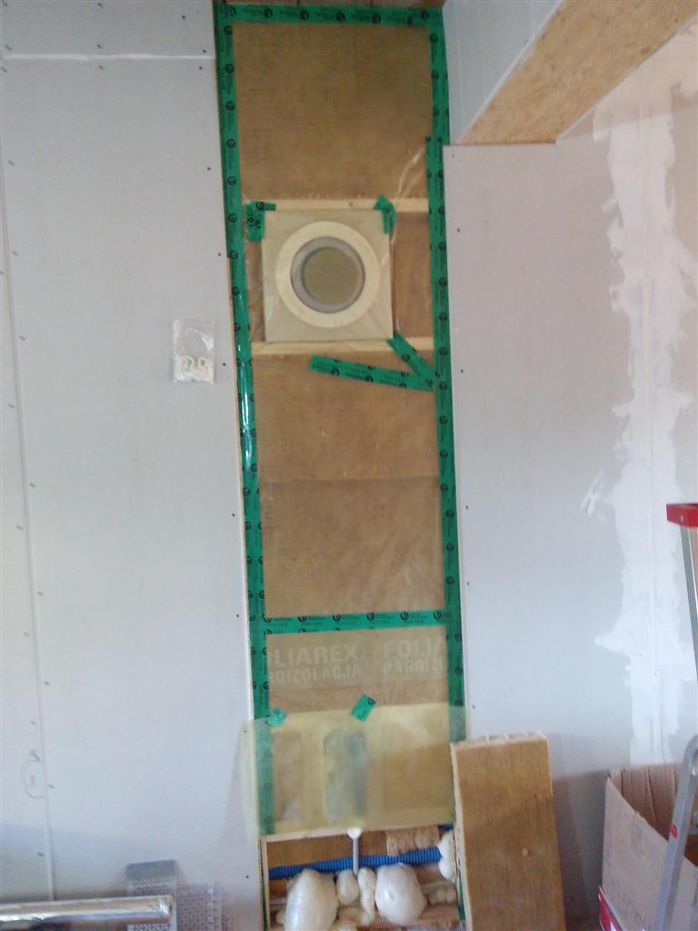 Stefan muss heute lange arbeiten. Mona ist noch krank -> nur Heidi hält die Stellung und versieht den Bereich hinter dem Ofen mit Dämmung sowie Dampfsperrfolie