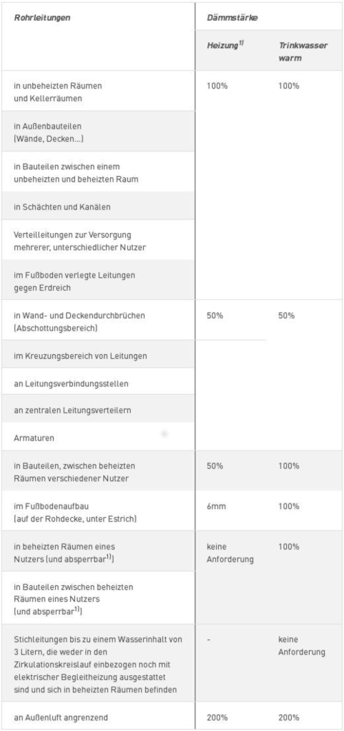Die EnEV gibt Mindestanforderungen für die Dämmdicke von Rohrleitungen und Armaturen vor. Den Regelfall stellt die sogenannte 100%-Dämmung dar. Das heißt alle warmgehenden Rohrleitungen wie Heizungsleitungen (HZ), Trinkwasser warm (PWH) und Trinkwasser Zirkulation (PWH-C) sind mit einer Dämmstärke zu ummanteln, die mindestens dem Innendurchmesser der Rohrleitung entspricht. Dies gilt bei Verwendung von Dämmstoffen mit einer Wärmeleitfähigkeit von λ = 0,035 W/(m•K). Beim Einsatz von Dämmstoffen mit höherer Wärmeleitfähigkeit sind die Dämmstärken anzupassen.