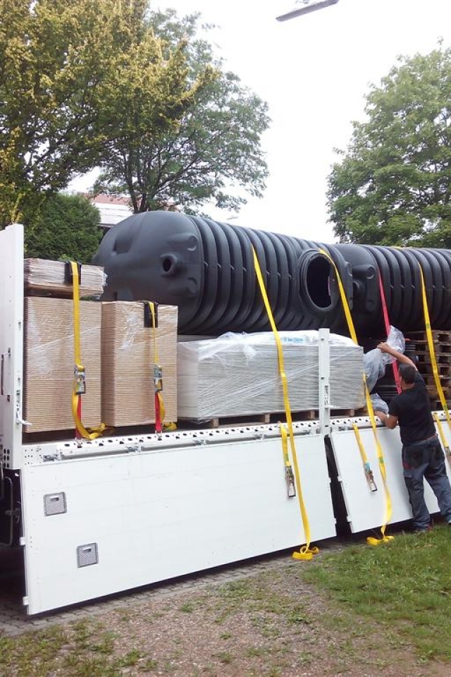 Auch gut geklappt: weil es die Nacht geregnet hatte und die Wiese noch nass war konnten wir auch die beiden Regenwassertanks gut bis tief in den Garten reinschieben.