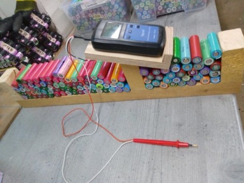 - Spannungsprüfung: Tiefenentladung (= 2,5V und niedriger) schädigt Li-Ion Zellen. Hier kommt es auf die Dauer der Tiefenentladung an, je länger desto schädlicher. Ich entsorge solche tiefentladenen sowie 0-Volt-Zellen, bei denen ich nicht weiß, wie lange sie schon tiefenentladen sind. Dazu gehören generell alle Zellen aus Laptopakkus. Viele Powerwall-Bastler lassen einmal getestete Zellen noch rund 4 Wochen ruhen und prüfen die Spannung danach erneut um einen Spannungsverlust zu messen. Ich mache das nicht da der Aufwand bei über 10.000 Zellen einfach zu hoch ist, und ich minimal abfallende Spannungen vertreten kann da ich in all meinen Systemen aktive Balancer verbaut habe, die das ausgleichen.