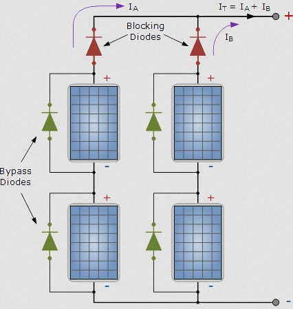 Die grünen Bypass-Dioden sind die oben bereits beschriebenen, intern verbauten Dioden. Die sind auf der Schemazeichnung lediglich zum besseren Verständnis außerhalb der Module eingezeichnet.