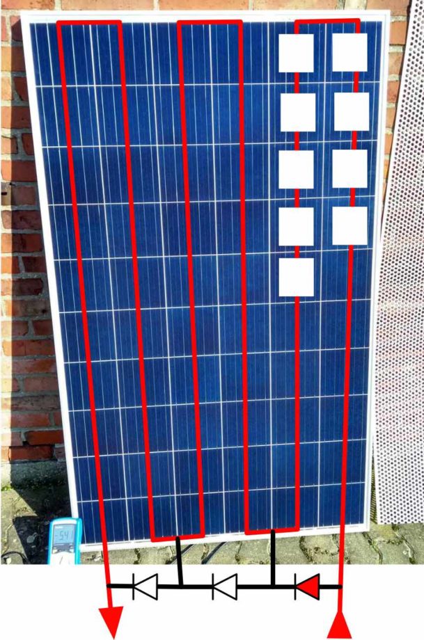 Werden zwei solcher Reihen verschattet reduziert sich die Leistung um 2/3 und erst bei einer kompletten Verschattung werden alle drei Felder durch die Bypass-Dioden umgangen.
