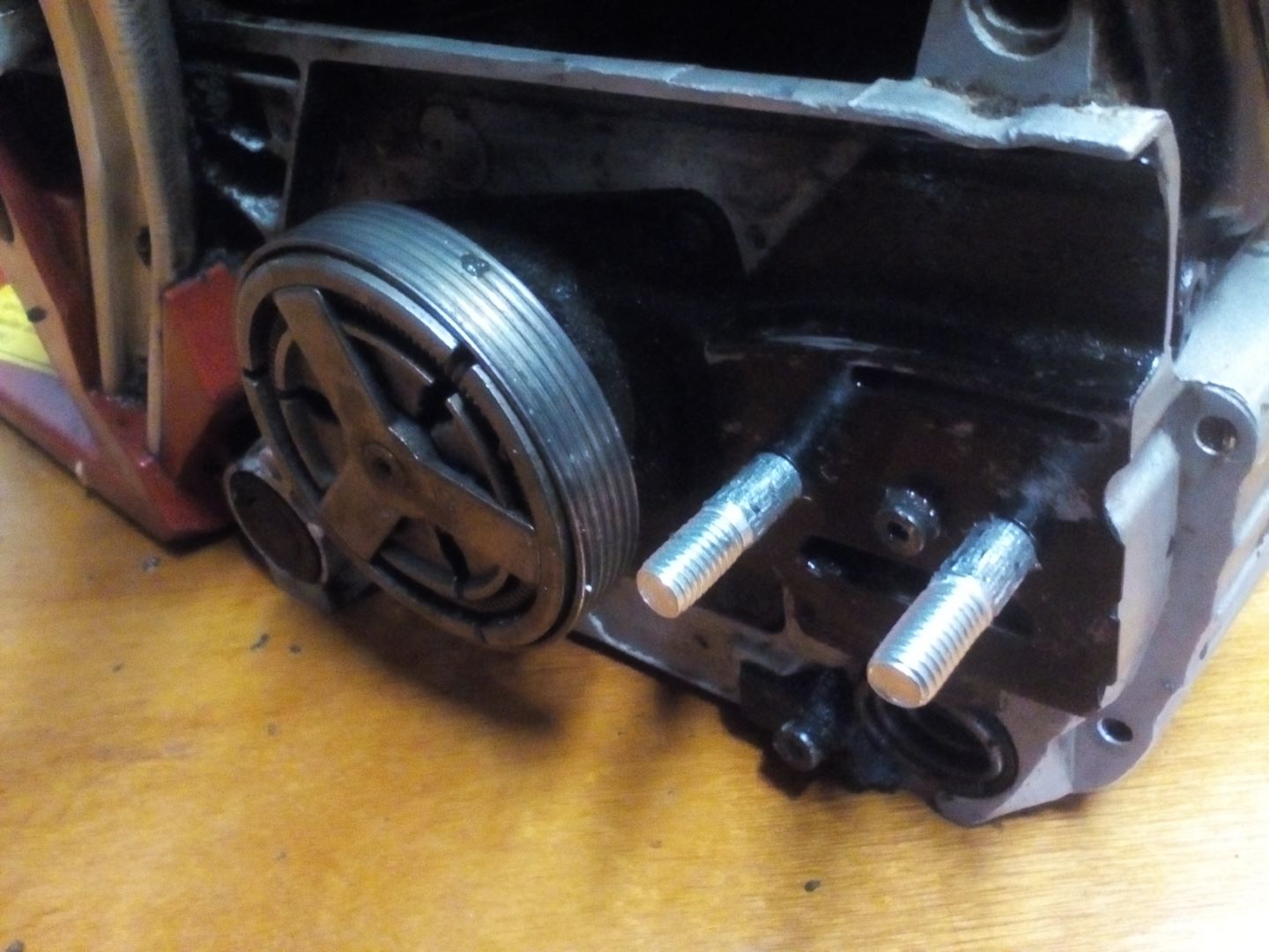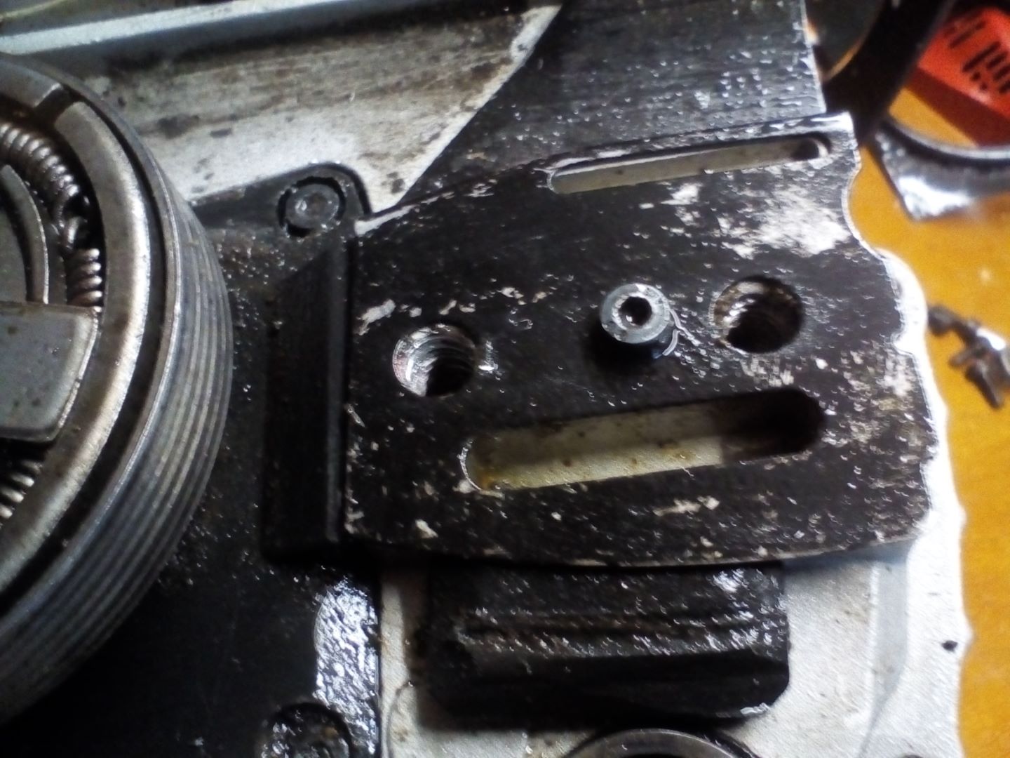 mit der Zange nochmal reindrehen, dabei den linken Stehbolzen zuerst einschrauben. Darauf achten, dass der Stehbolzen nicht schief eingeschraubt wird sonst ist das Gewinde im Gehäuse der Motorsäge kaputt und dann kann man die Maschiene so gut wie wegwerfen. Auch darauf achten, mit der Zange nicht das Gewinde zu greifen