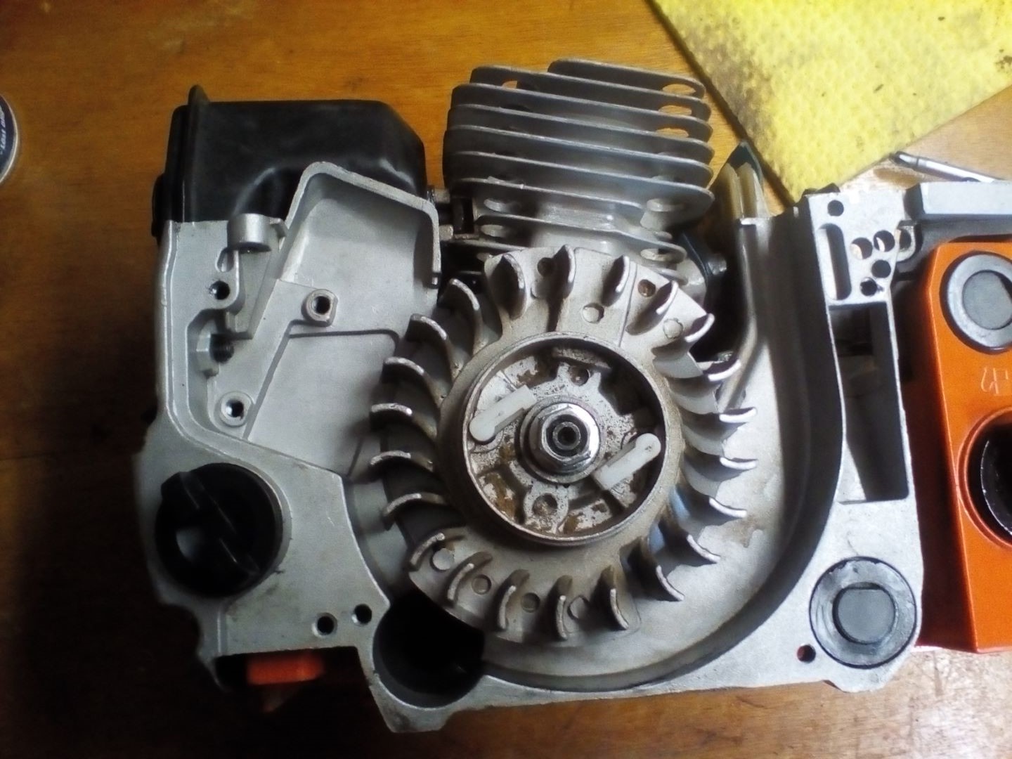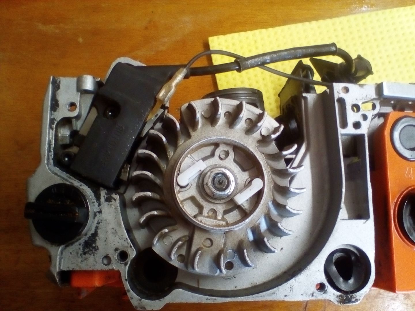 Links oben sitzt nun das Zündmodul. Das Polrad ist mit Magneten ausgestattet und erzeugt so im Vorbeidrehen an der Zündspule ein magnetisches Feld, durch welches ein Strom induziert wird