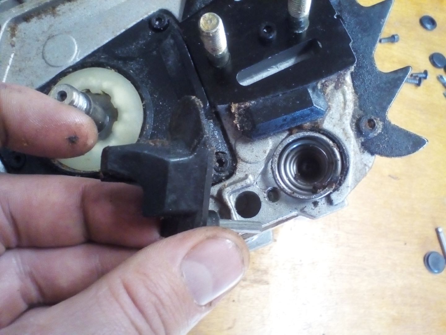 - das Gestänge des Gashebels: das ist etwas fummelig. Wenn sich das Kurbelwellengehäuse erstmal aus den Gummidämpfern gelöst hat nimmt man am besten das gesamte Kurbelwellengehäuse in die linke Hand, hält mit der rechten den Griff am Tankgehäuse fest und dreht das Kurbelwellengehäuse beim Ziehen so, dass sich das verwinkelte Gasgestänge durch die Gummidichtung ziehen lässt, dann muss man das Gestänge nicht zerlegen. Das geht einfacher, wenn man dabei den Gashebel ab und zu drückt und dabei das Gestänge bewegt. Achja: das Auseinanderziehen gelingt nur, wenn man auch den großen Haltebügel / Griff vorher abschraubt (2 Kreuzschrauben an der Seite, zwei von unten am Boden), damit genug Platz ist um das Kurbelwellengehäuse hin und her zu drehen