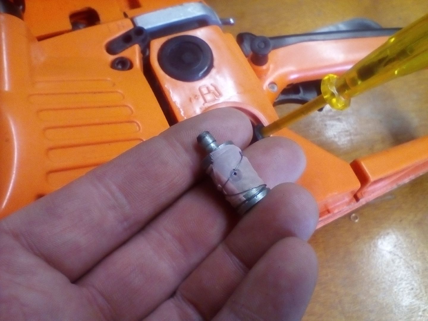 In meinem Fall hat es im Tank komisch rumgeklappert, also habe ich nachgeschaut, nichts gesehen und daher mal mit einer großen Pinzette den Kraftstofffilter geangelt (ja, im Hintergrund steckt ein Schraubenzieher im Spritschlauch - ganz einfach damit dieser nicht wieder in den Tank rein abhaut).