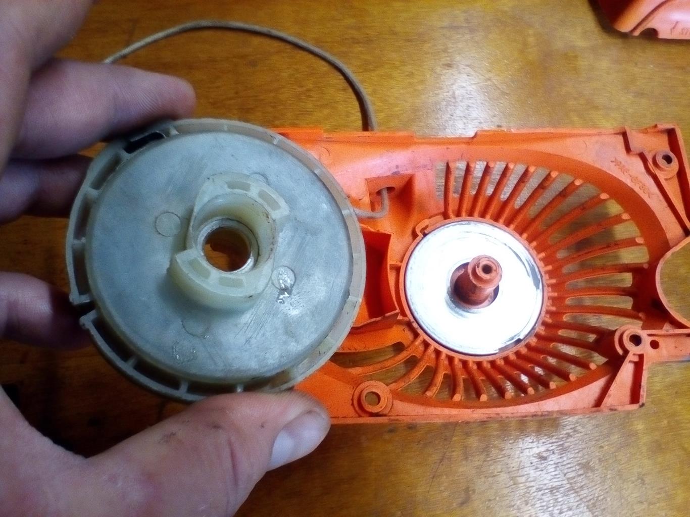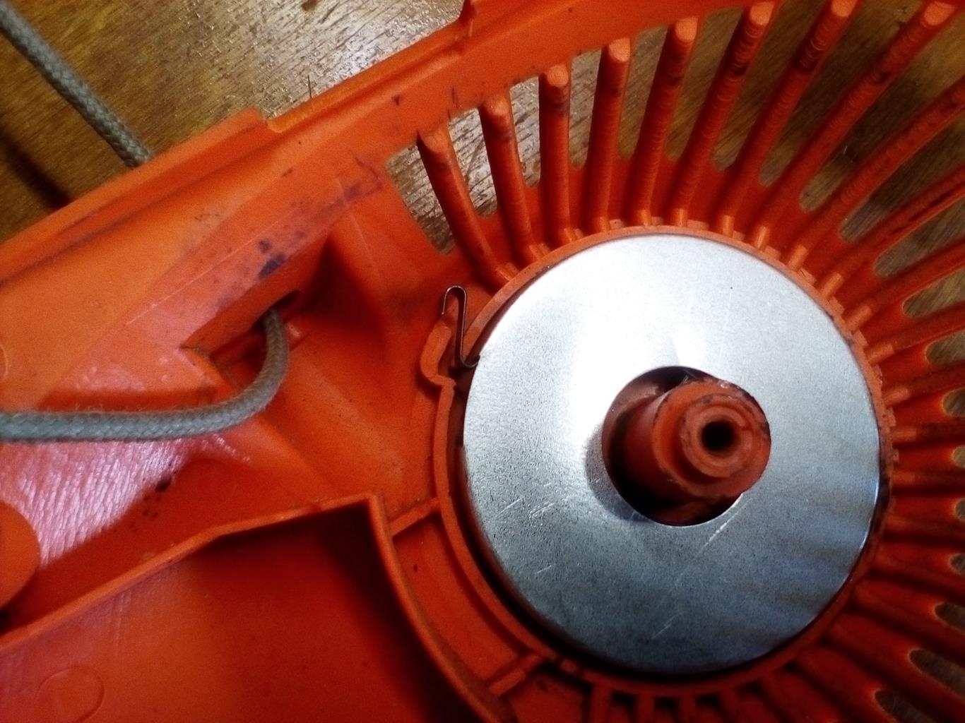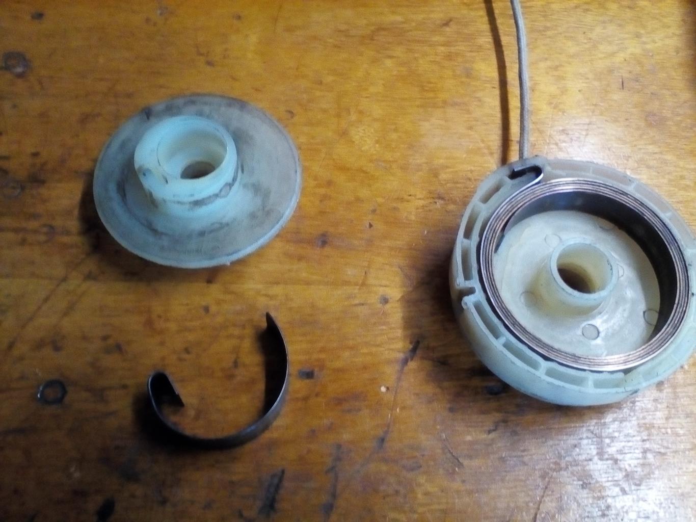 die obere Hälfte der Seilzugrolle abnehmen, da sitzt die Easy-Start Feder drin. In der verbliebenden unteren Hälfte sitzt die Feder zum Aufrollen des Seilzuges drin.