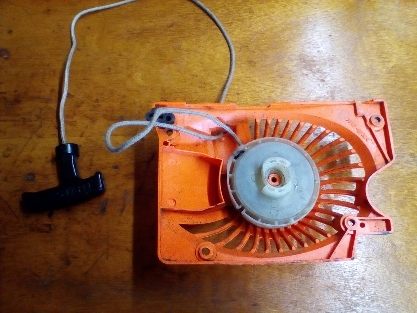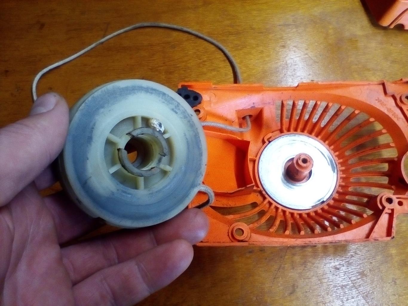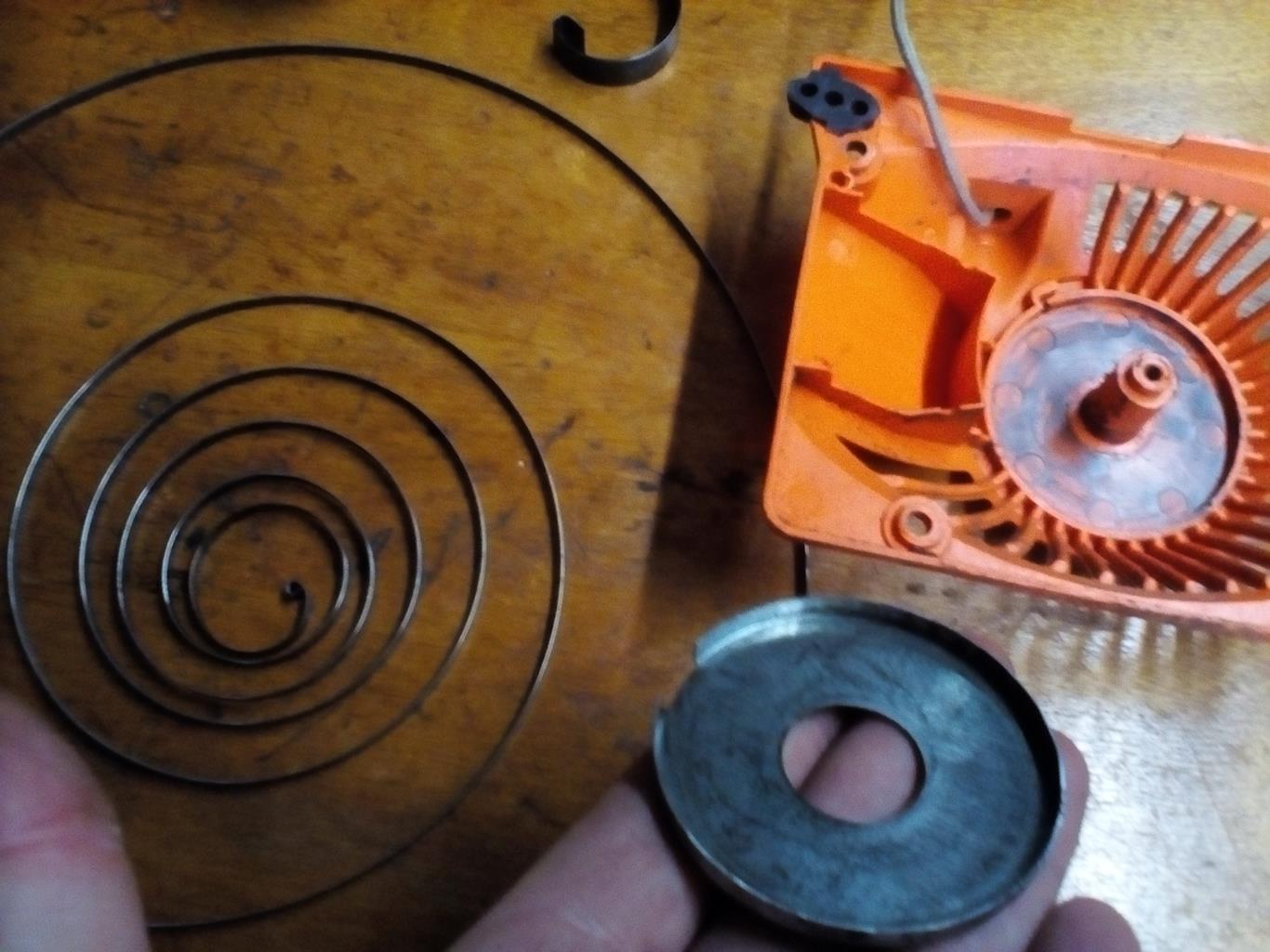 die obere Hälfte der Seilzugrolle abnehmen, da sitzt die Easy-Start Feder drin. In der verbliebenden unteren Hälfte sitzt die Feder zum Aufrollen des Seilzuges drin.