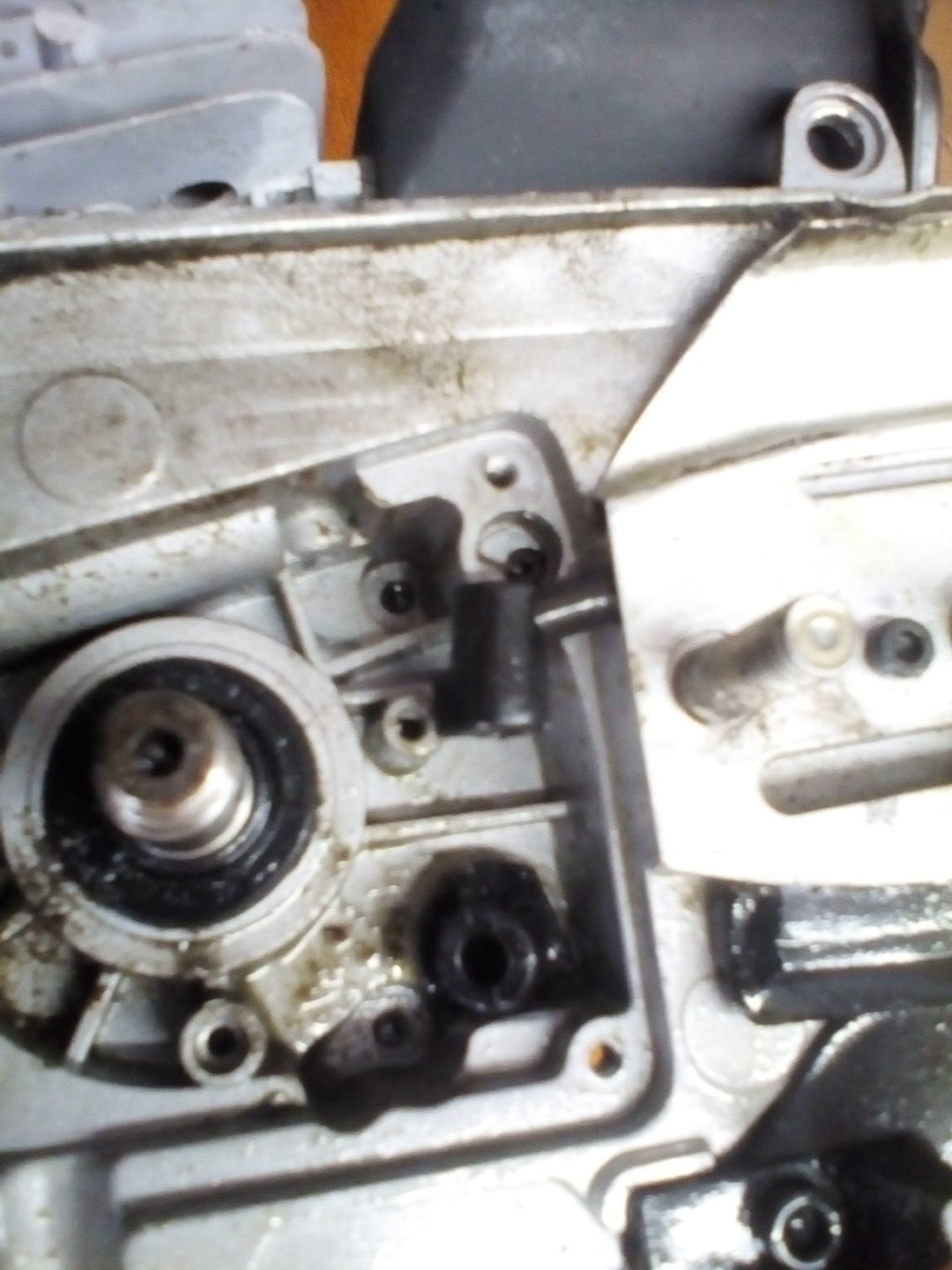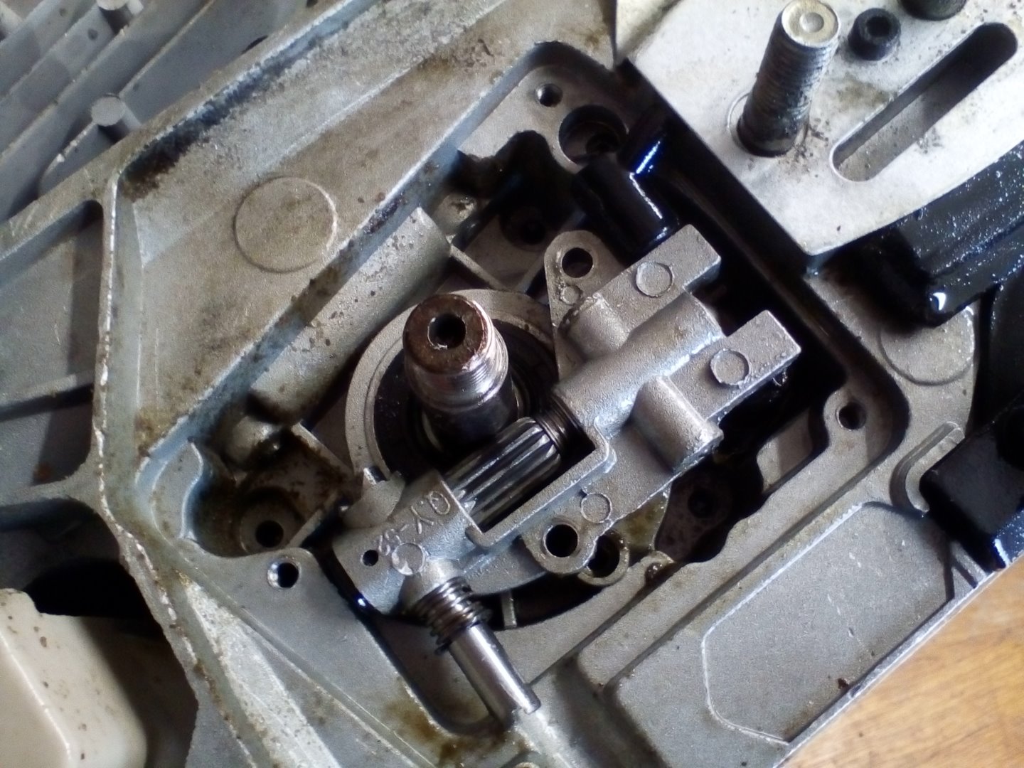 es gibt zwei Ölschläuche, den kürzeren der beiden sieht man hier oberhalb der Öklpumpe, er fördert das Kettenöl von der Pumpe zum Schwert. Den kann man einfach abziehen, wenn die zwei Schrauben an der Ölpumpe gelöst sind