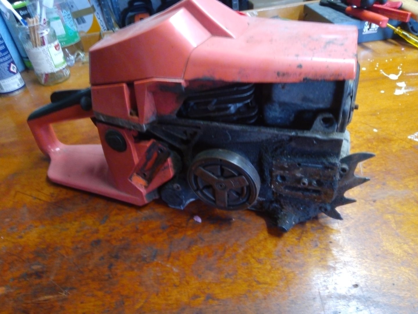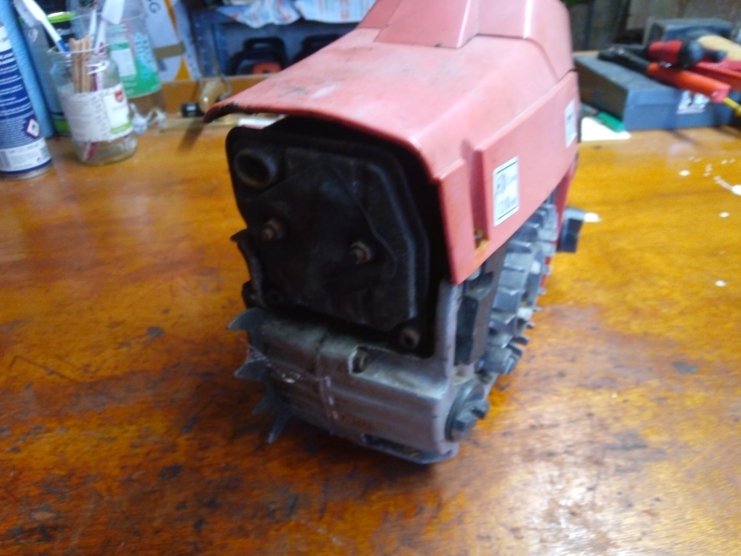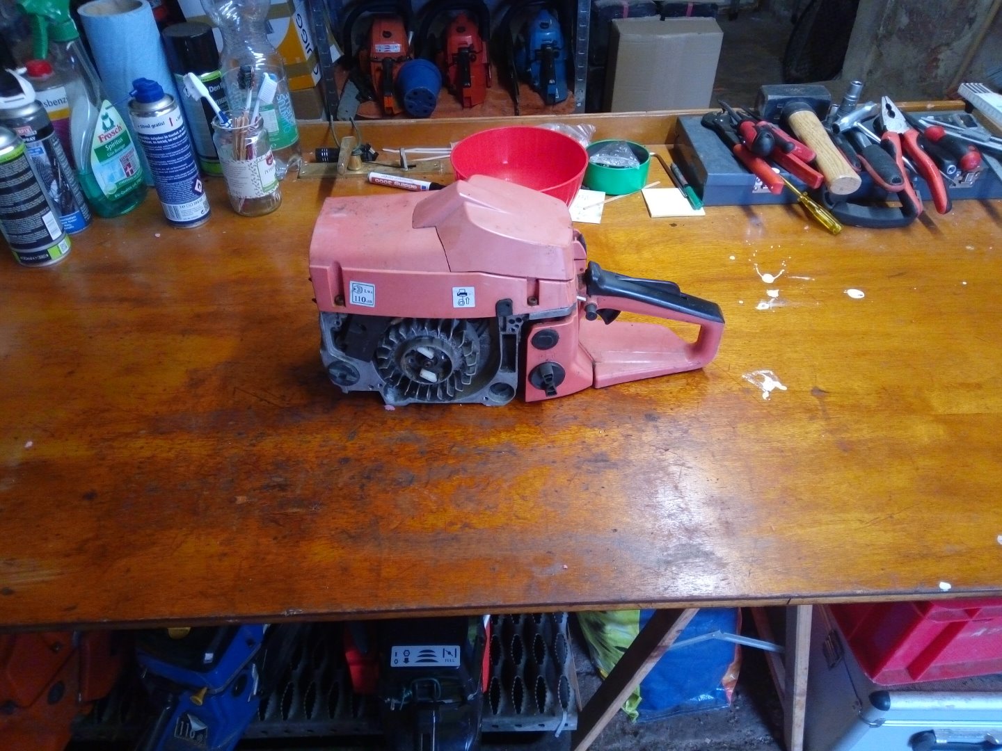 danach kam die Motorsäge wieder auf die Werkbank und wurde zerlegt, um einen neuen Zylinderkopf einzubauen