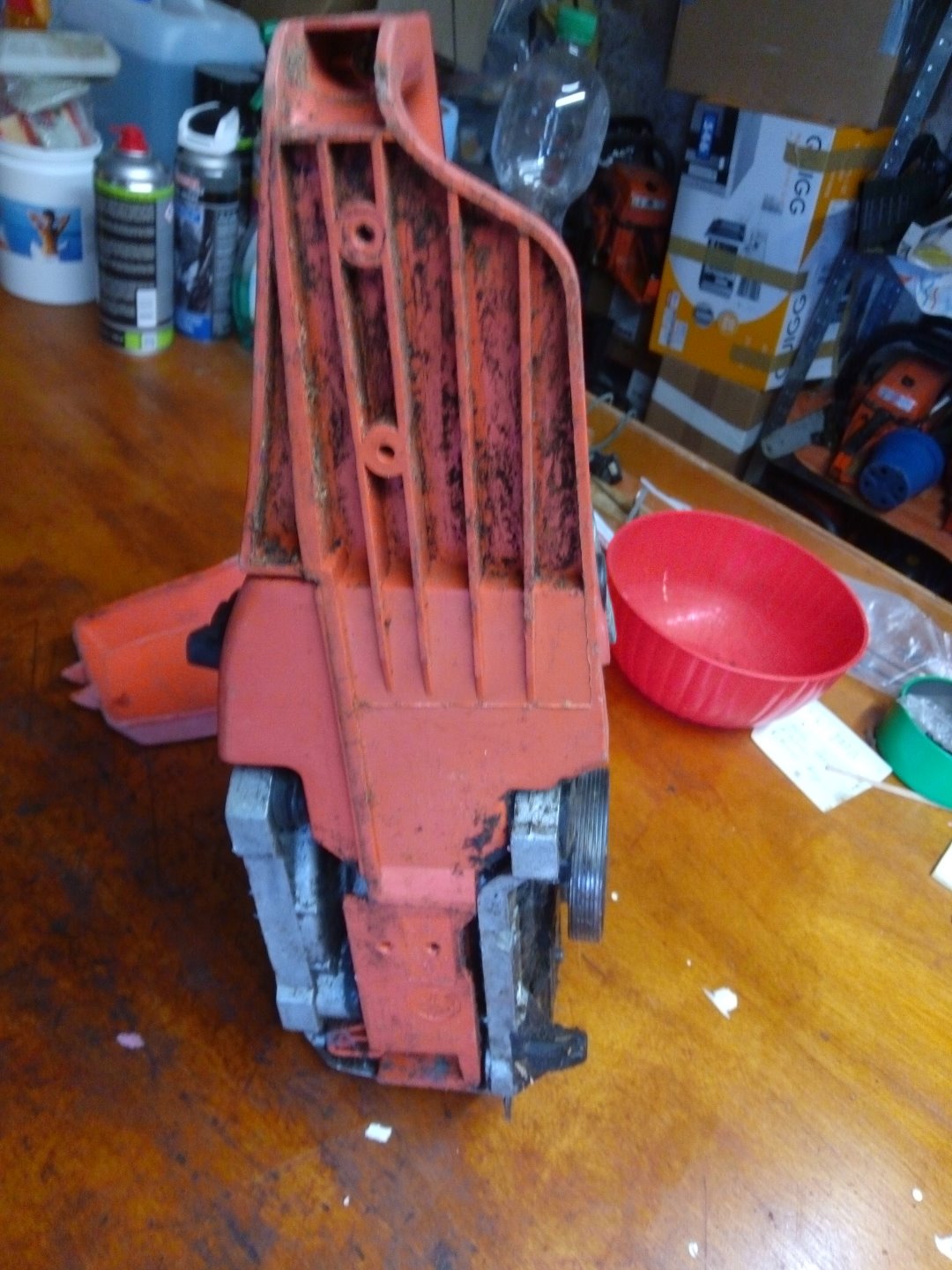 Hier bin ich mir nicht einmal 100% sicher, was das einmal war, könnte dem Aussehen des Luftfilterdeckels nach aber eine alte Timberpro mit 58cc sein